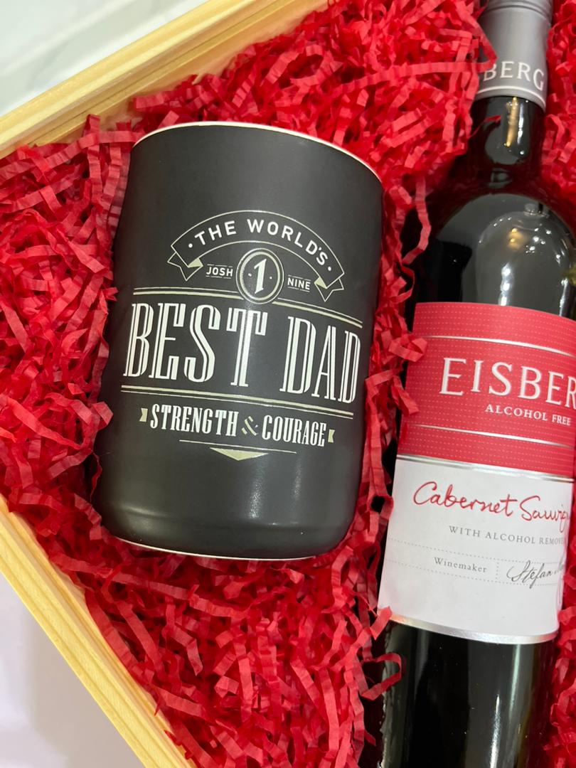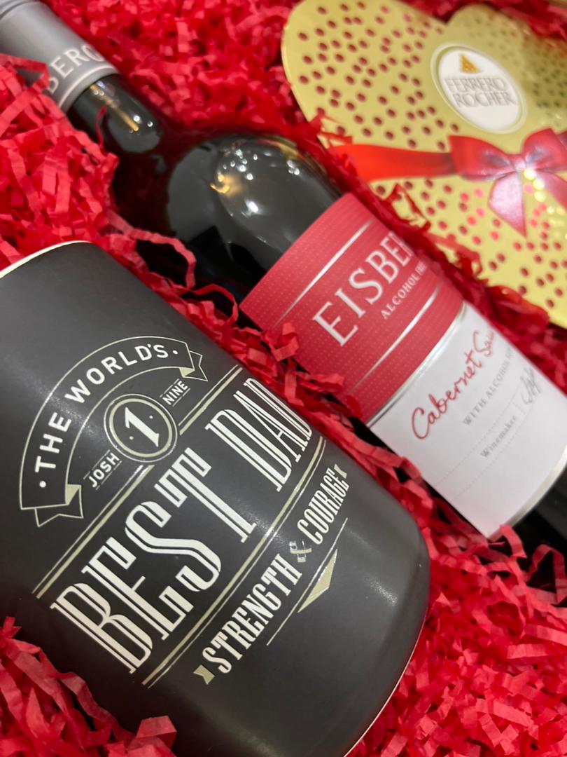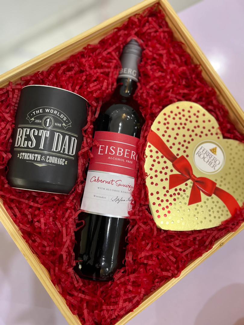 Presented in a wooden gift box with a see through glass lid for an elegant finish, this thoughtful set includes a “Best Dad” mug for his morning brews, indulgent Ferrero Rocher chocolates to sweeten his day, and Eisberg’s non-alcoholic red wine for a toast to cherished moments.