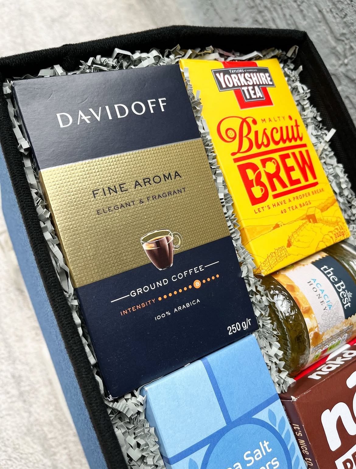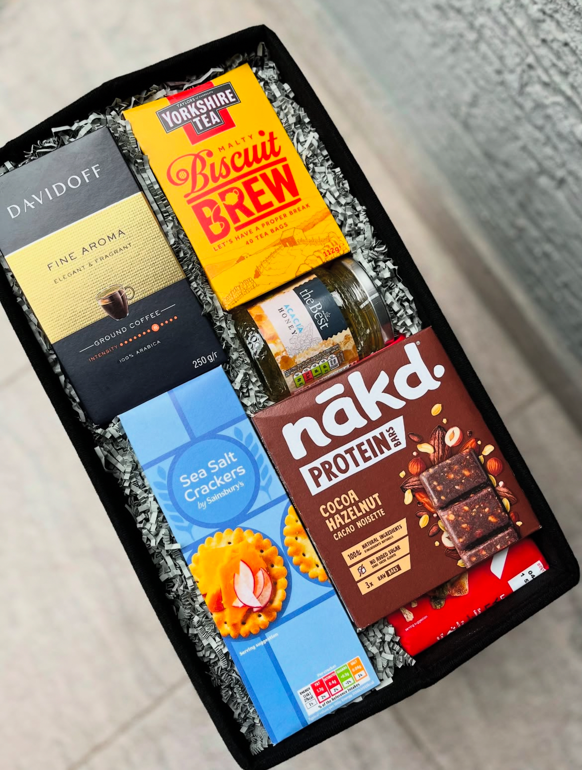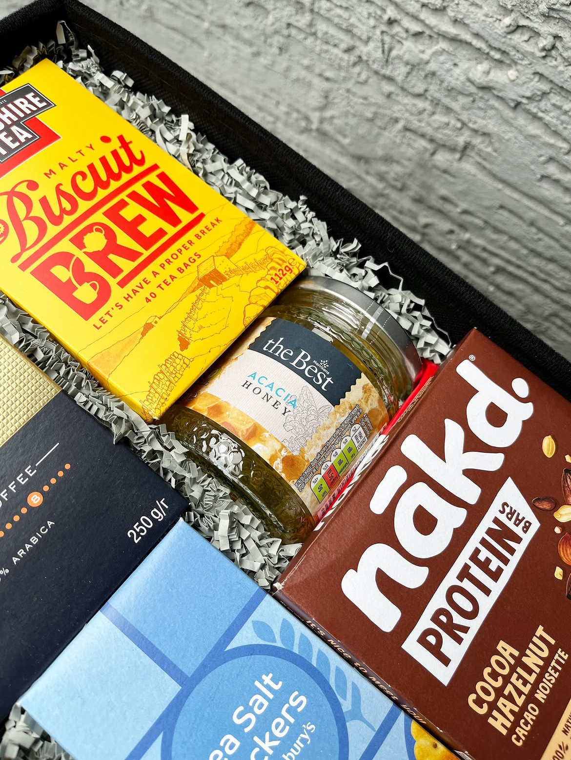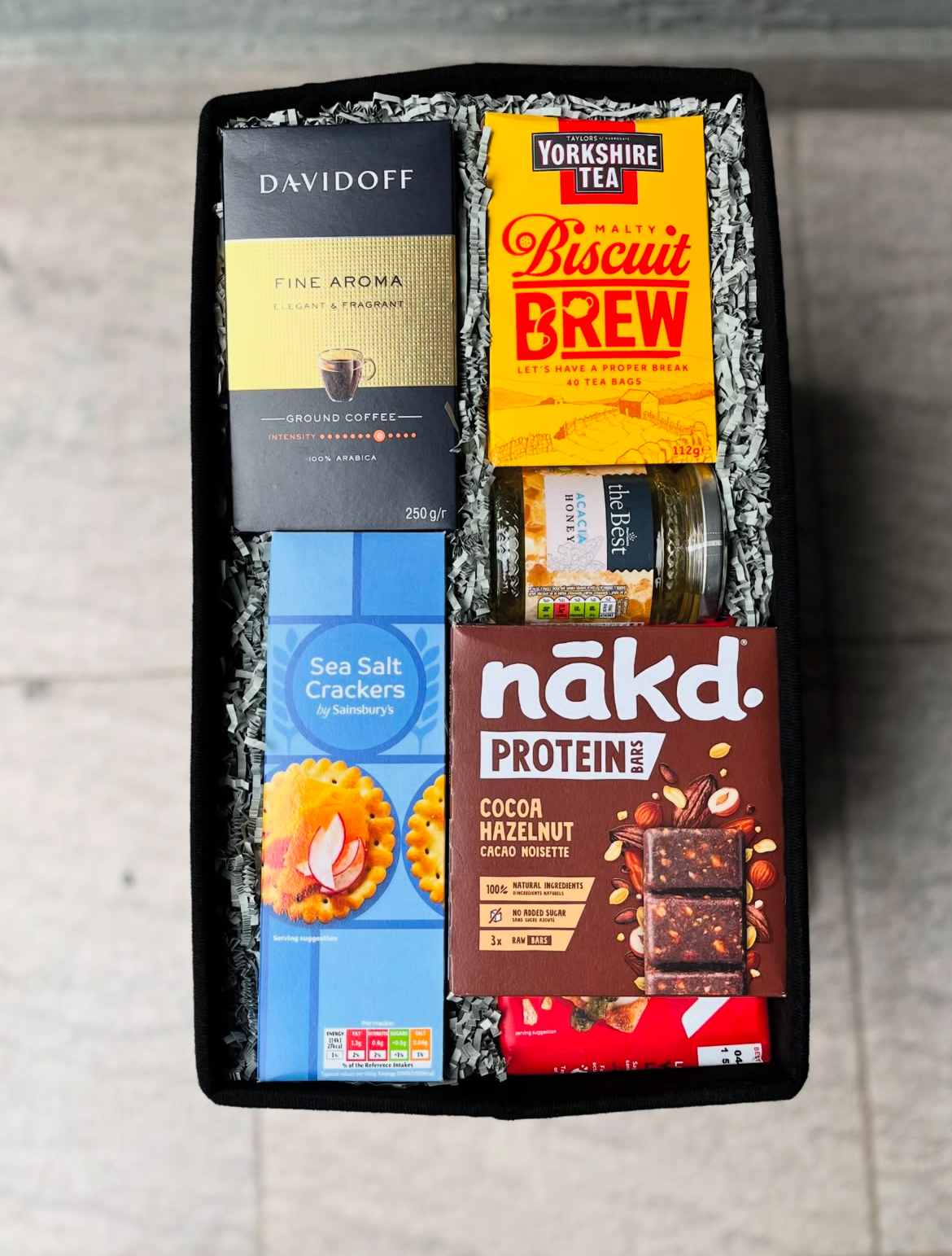 For moments of calm and comfort, the box includes Davidoff coffee and Malty Biscuit Brew tea, perfectly paired with unsweetened almond milk and a jar of pure acacia honey, allowing for a soothing, customisable experience.
