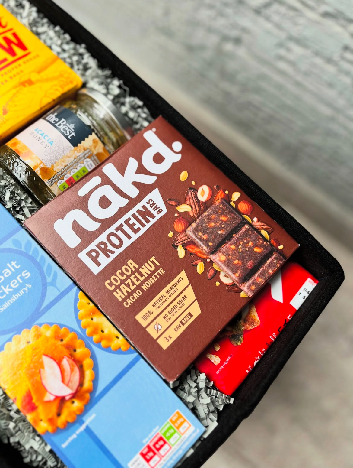 A selection of gourmet cashew nuts, Nakd protein bars, and Diabetic Wonder Crunch cookies provide satisfying, better-for-you snacking options, while sesame grissini breadsticks, sea salt crackers, and Ryvita crispbread add a delightful crunch with a wholesome twist.