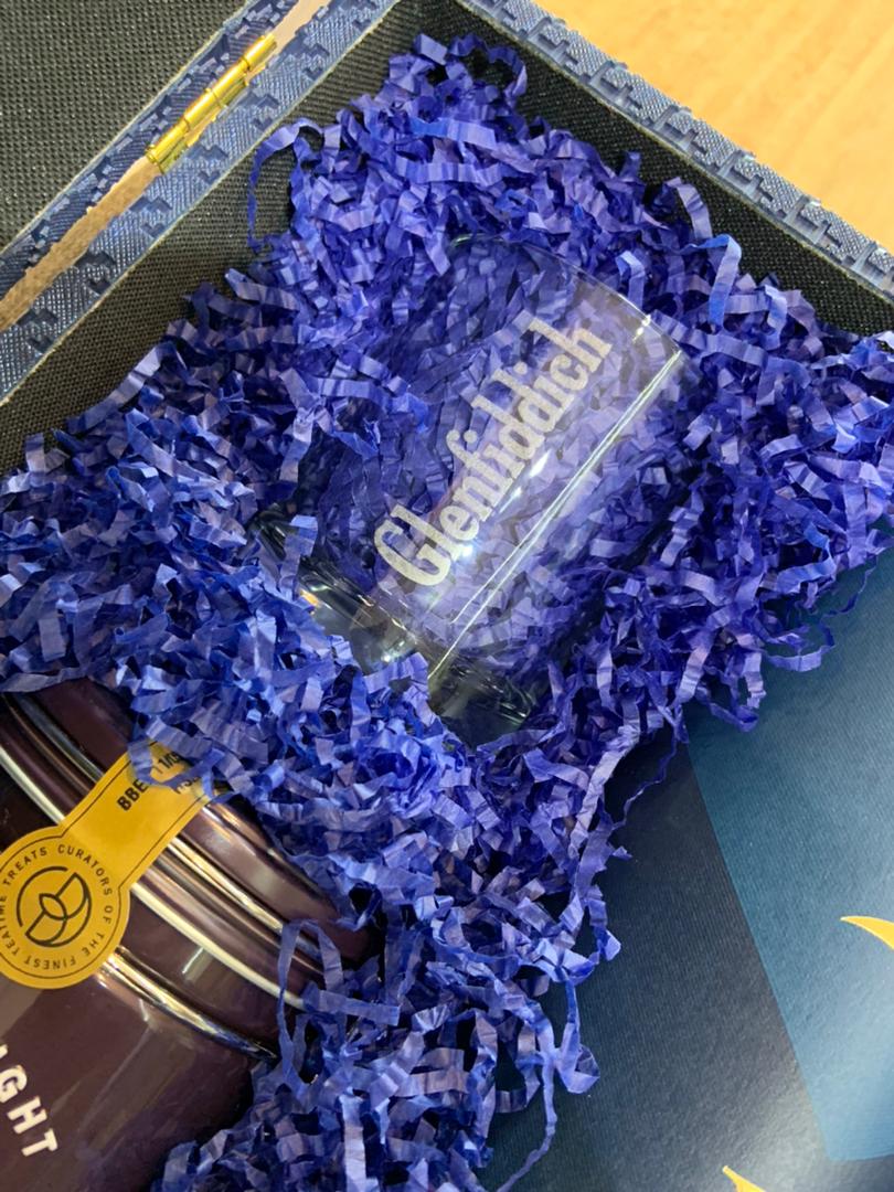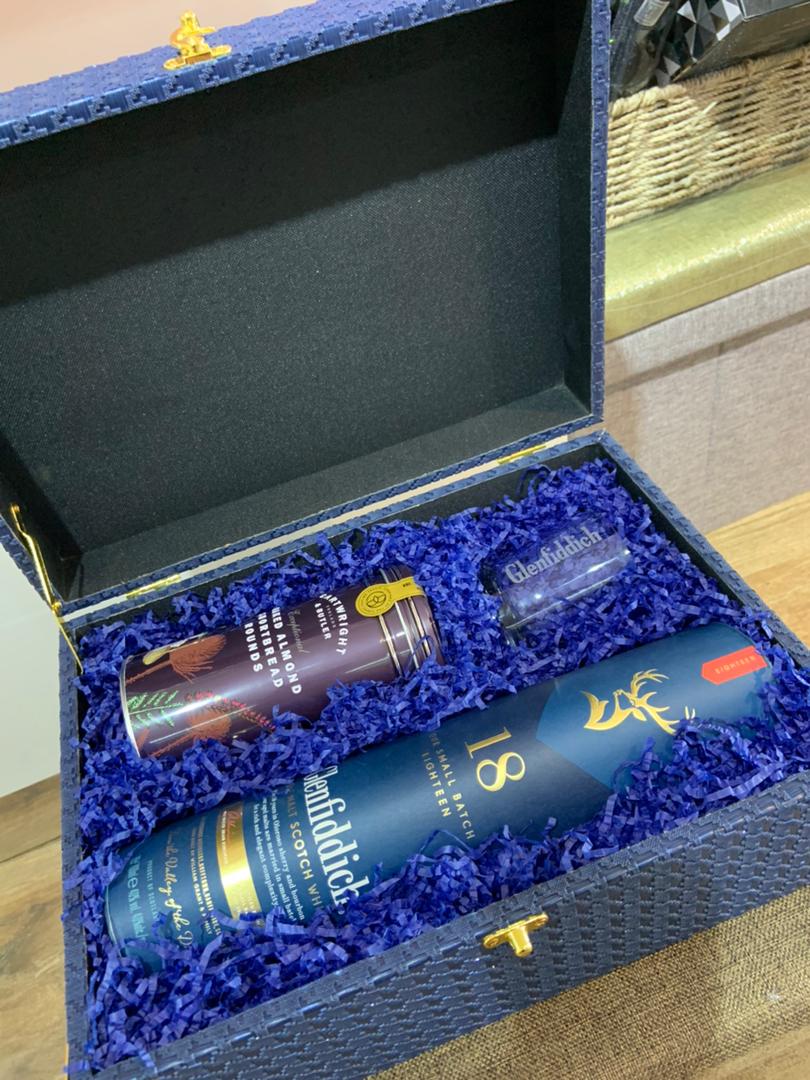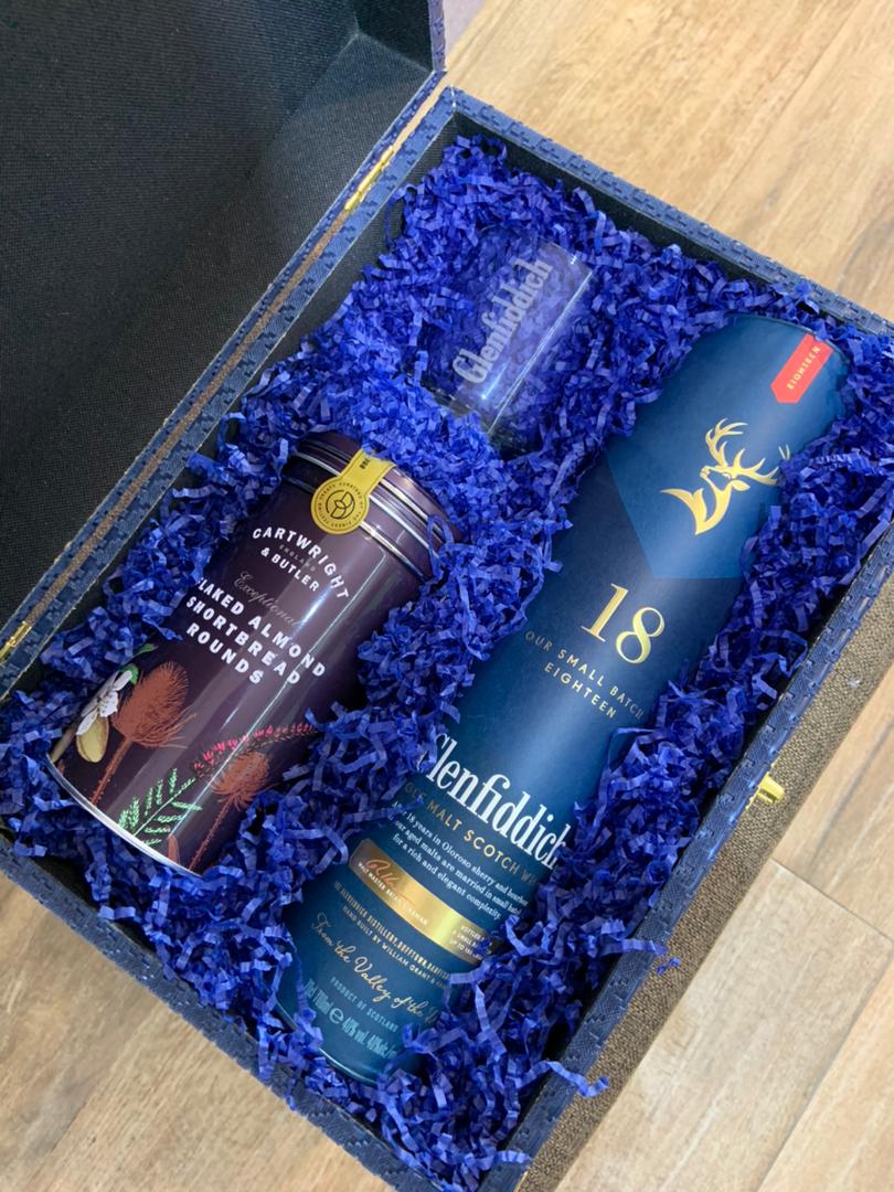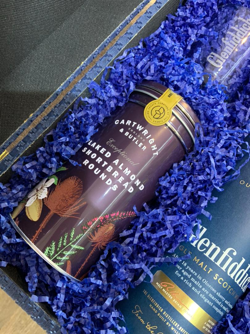 Presented in a luxury blue-themed trunk, this refined set features the award-winning Glenfiddich 18-Year-Old Single Malt, renowned for its depth, richness, and smooth finish. A matching Glenfiddich whisky glass adds an elegant touch to every sip, while an assortment of Cartwright & Butler’s tinned cookies provides a sweet, buttery complement to the distinguished dram.