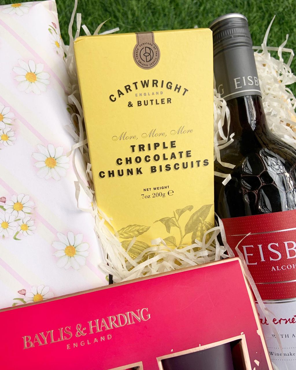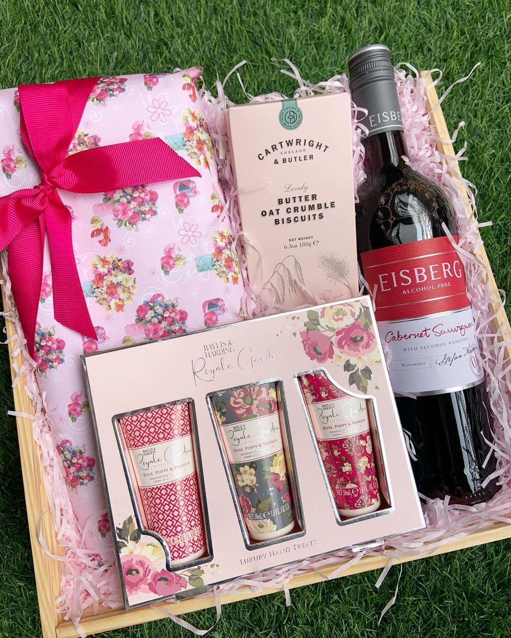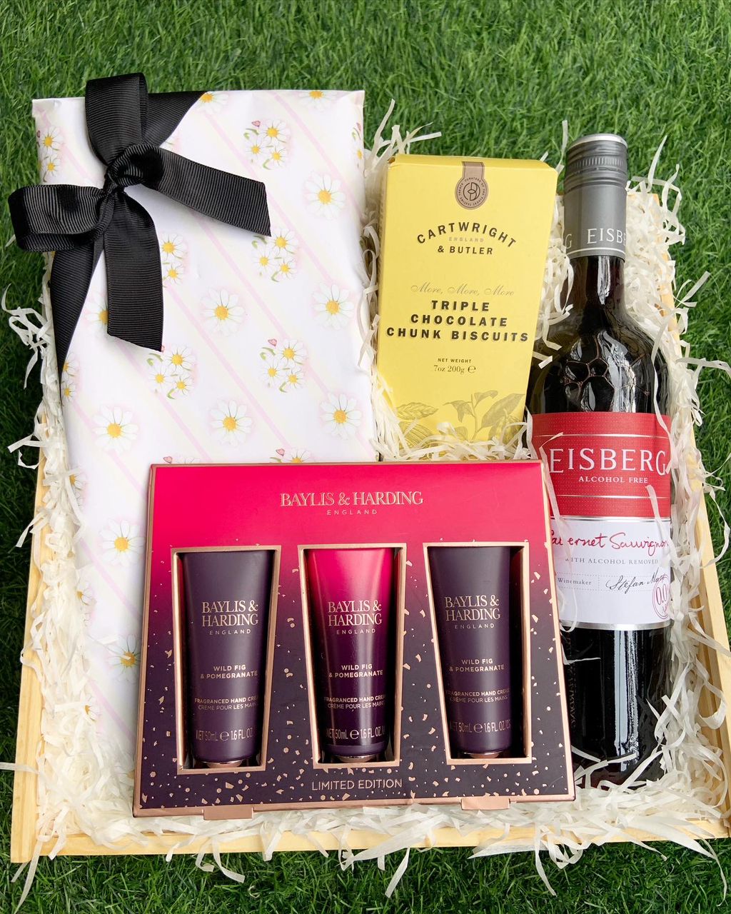Presented in a wooden gift box wrapped with soft mesh, this elegant hamper celebrates timeless femininity with a touch of cultural pride. Inside, a premium African Adire fabric adds vibrant artistry, Eisberg’s non-alcoholic red wine offers a toast to life’s moments, Baylis & Harding’s indulgent hand cream set pampers with care, and Cartwright & Butler’s premium cookies bring a sweet, buttery finish.