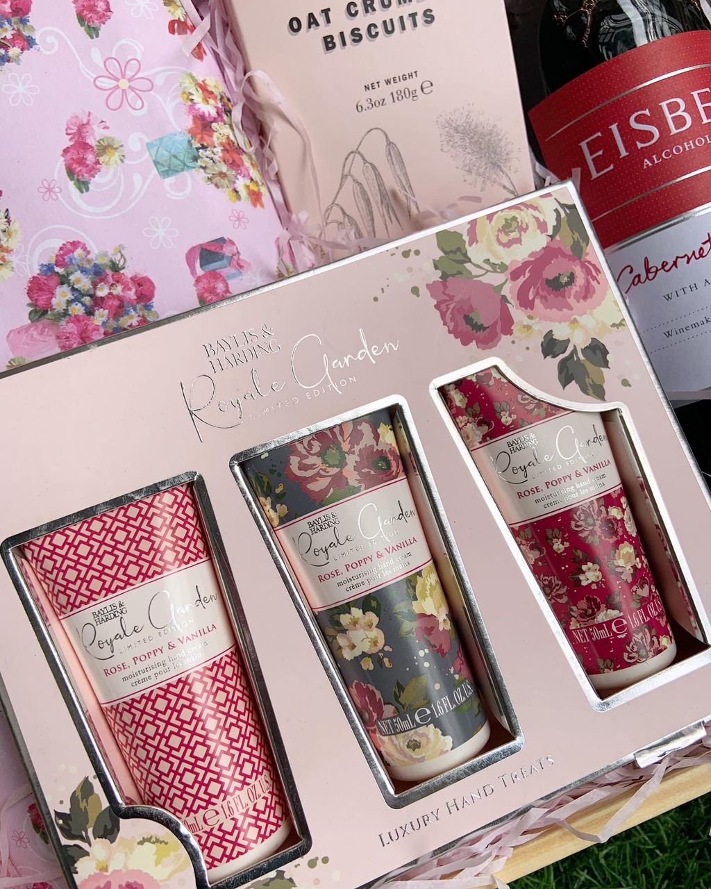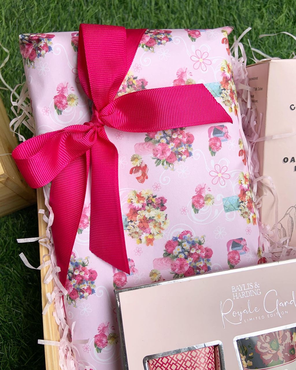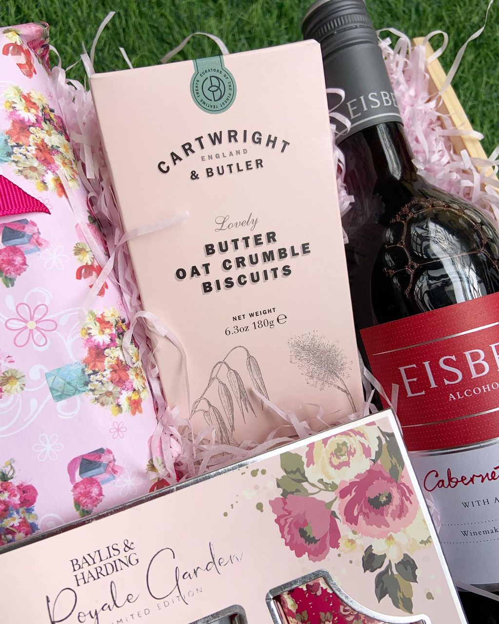 Presented in a wooden gift box wrapped with soft mesh, this elegant hamper celebrates timeless femininity with a touch of cultural pride. Inside, a premium African Adire fabric adds vibrant artistry, Eisberg’s non-alcoholic red wine offers a toast to life’s moments, Baylis & Harding’s indulgent hand cream set pampers with care, and Cartwright & Butler’s premium cookies bring a sweet, buttery finish.